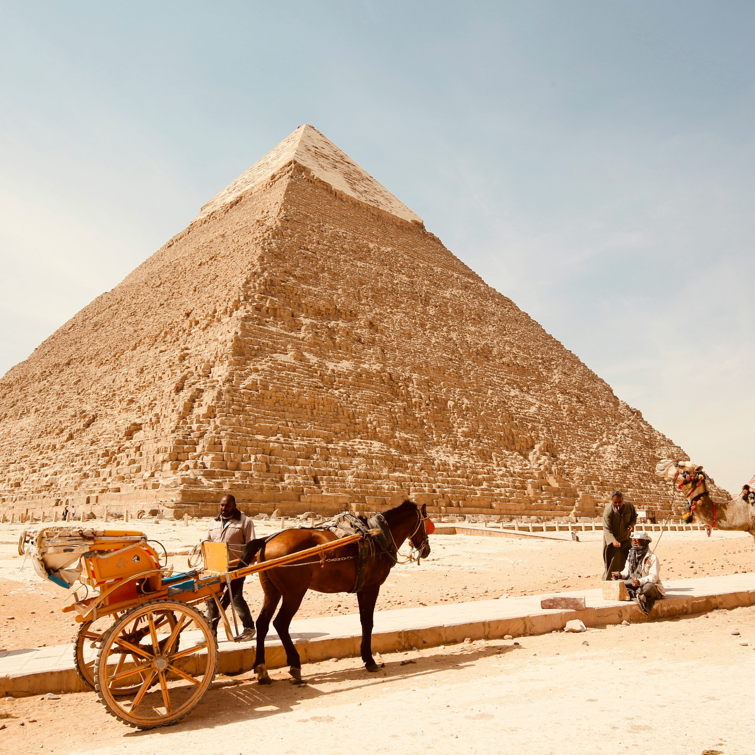 Arrive at the Giza Plateau, home to the Great Pyramid of Khufu, Pyramid of Khafre, and Pyramid of Menkaure.