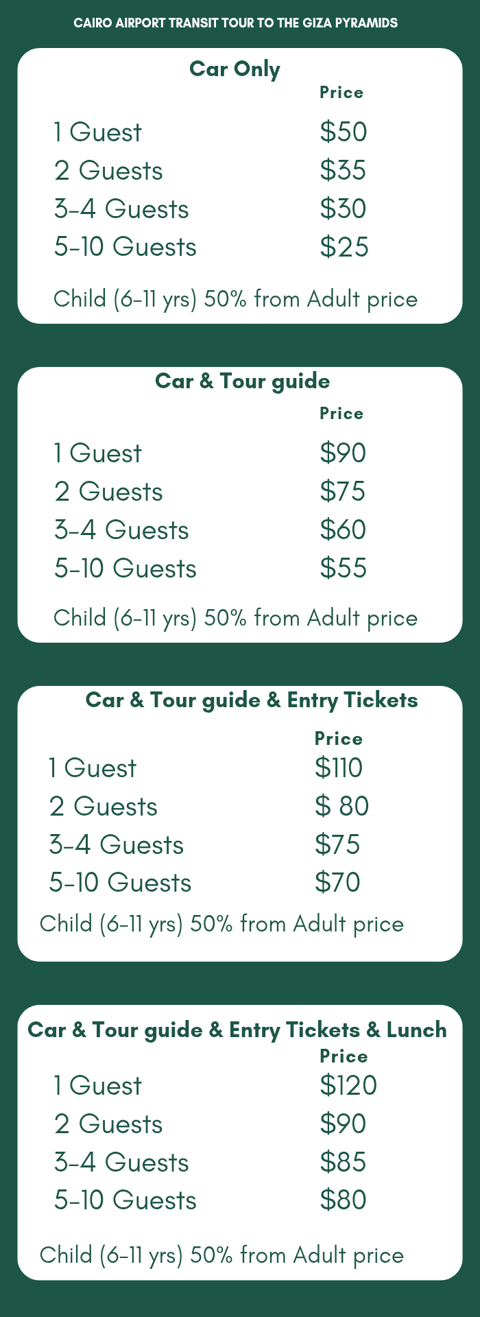 After exploring the Pyramids, you’ll be transferred back to Cairo Airport on time for your next flight — safe, comfortable, and full of unforgettable memories.