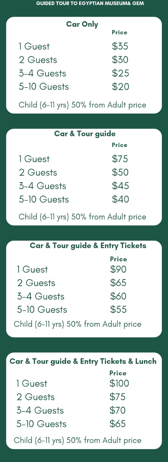 At the end of your tour, your driver will transfer you back to your hotel.