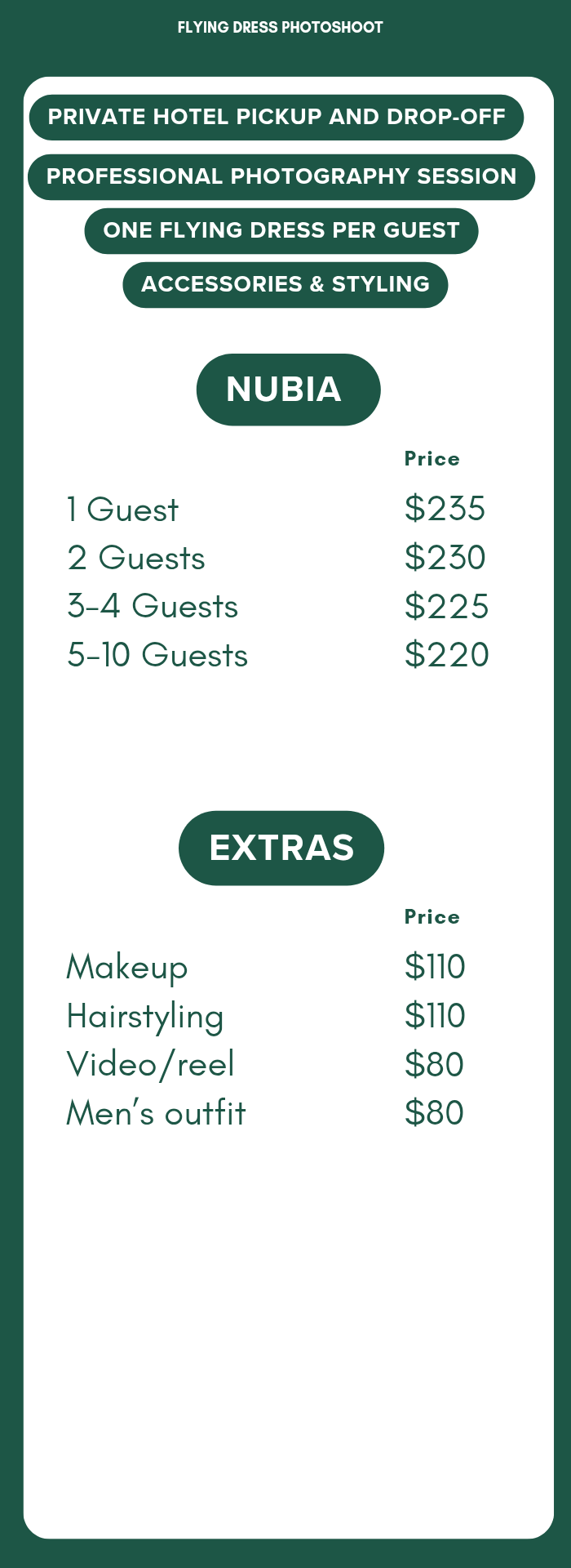 The entire experience lasts about 2–3 hours, including hotel pick-up, styling, and the photoshoot across multiple Nubian spots.