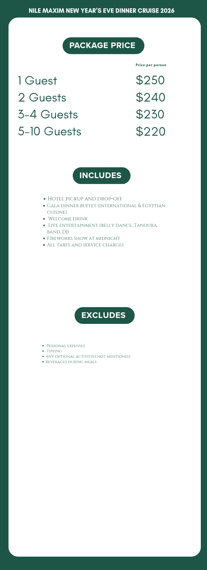 Dance, laugh, and celebrate as the Nile reflects the city lights and fireworks above.