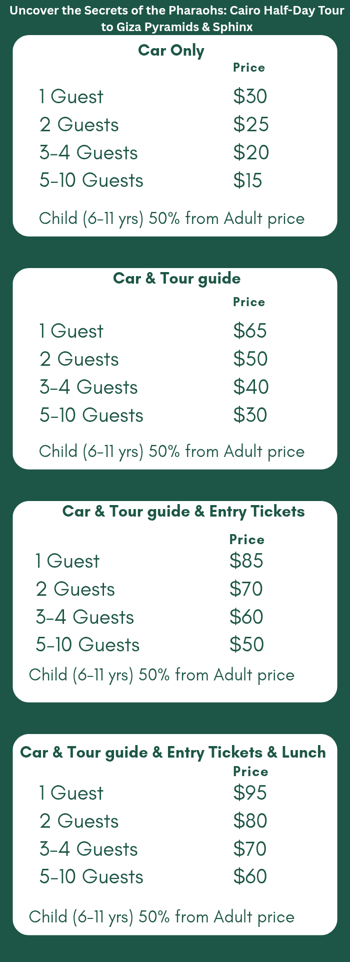 - Pickup Location: Your hotel in Cairo or Giza / agreed meeting point